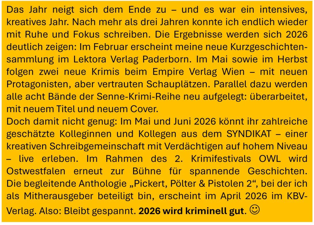 Ich freue mich, euch bei der einen oder anderen Lesung zu sehen – und verspreche: 2026 wird spannend, mörderisch und voller Geschichten.