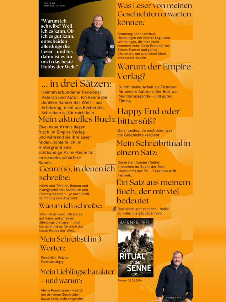 Heimatverbundener Pensionär, Veteran und Autor. Werner Pfeil kennt die dunklen Ränder der Welt – aus Erfahrung, nicht aus Recherche. Schreiben ist für ihn kein Ruhestand, sondern die nächste Mission.